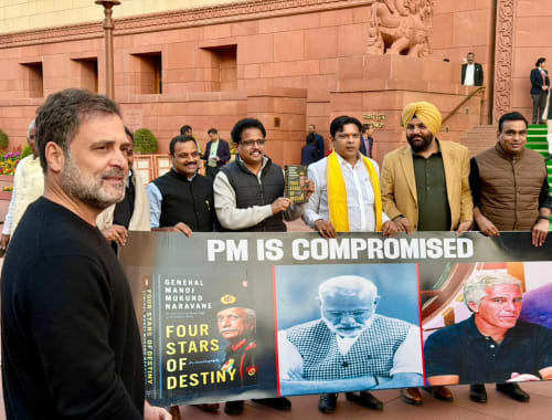 LoP (LS), Shri Rahul Gandhi, displayed former Army chief General Manoj Mukund Naravane’s book ‘Four Stars of Destiny’ while addressing the media at th